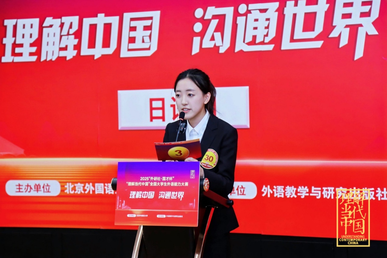 12月6日,2025年“外研社·国才杯”“理解当代中国”全国大学生外语能力大赛(多语种组)全国总决赛在北京顺利举行。我院日语系2023级本科生杨千益与鲁冠秀两位同学分获大赛金奖和银奖,日语系王琳、金文峰作为参赛指导教师指导参与并陪同观摩了比赛。